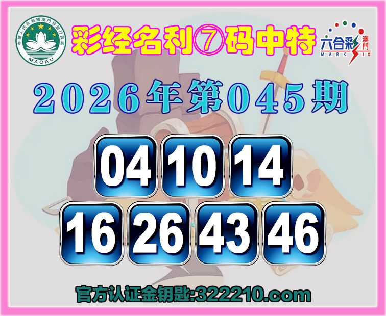 045期:〖彩经名利〗 🏇⑦码中特🏇【04.10.14.16.26.43.46】开:01