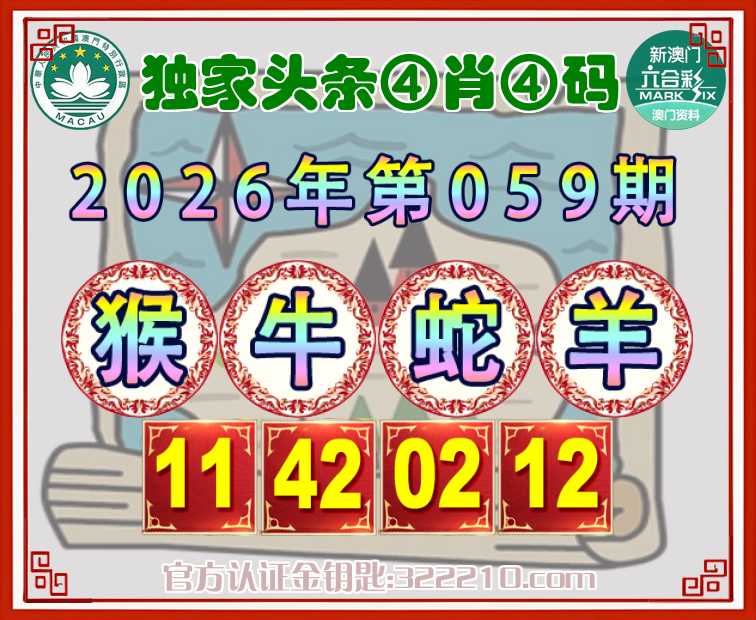 059期: 👉『独家头条』 👉④肖④码👉【猴牛蛇羊】【11.42.02.12】开:鸡10