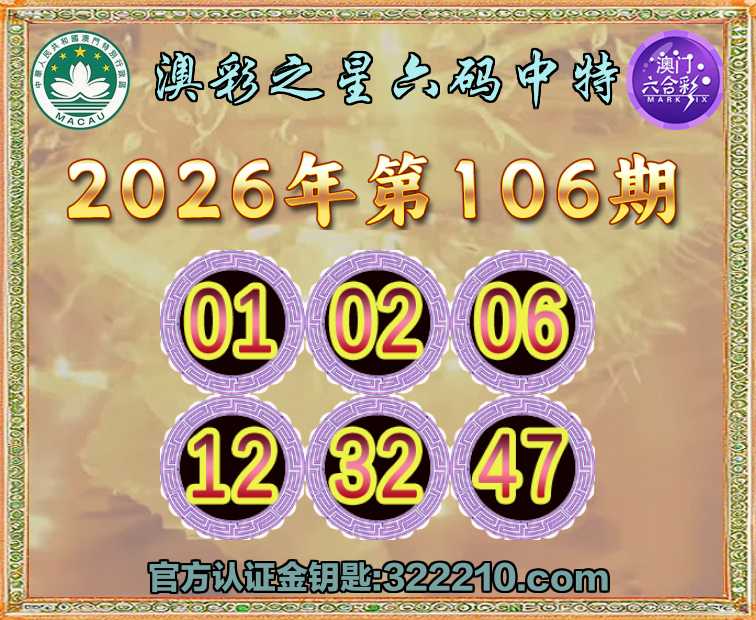 106期:《澳彩之星》 😍六码中特😍【01.02.06.12.32.47】开:22