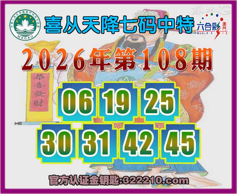108期:【喜从天降】 ⛩️七码中特⛩️【06.19.25.30.31.42.45】开:45
