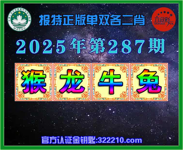 287期:『报特正版』 ☝️单双各二肖☝️【.龙.牛.兔】开:猴34