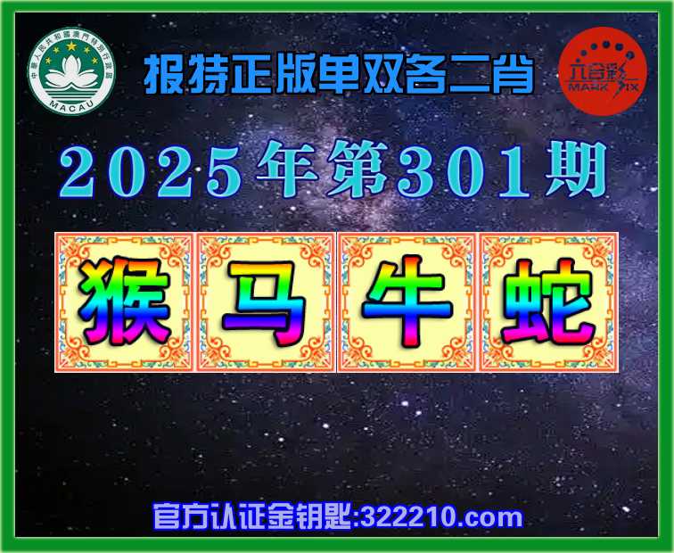 301期:『报特正版』 ☝️单双各二肖☝️【猴.马.牛.蛇】开:00准