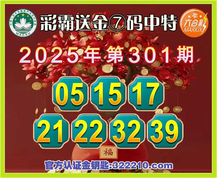 301期:【彩霸送金】 ☘️⑦码中特☘️【05.15.17.21.22.32.39】开:05
