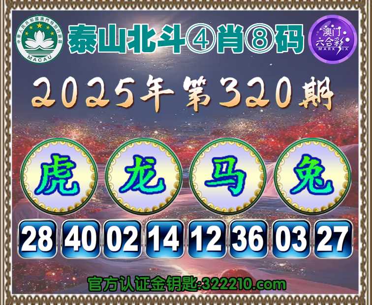 320期:【泰山北斗】 🏇④肖⑧码🏇【龙马兔】开:虎28
