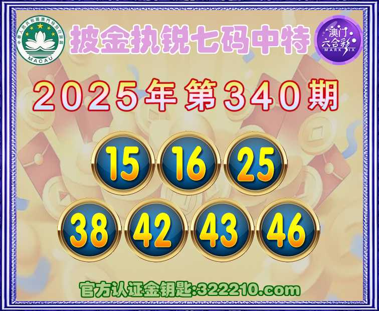 340期: 披金执锐 🏆七码中特🏆【15.16.25.38.42.43.46】开:16