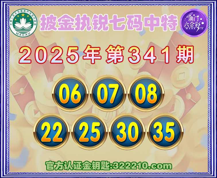341期: 披金执锐 🏆七码中特🏆【06.07.08.22.25.30.35】开:06