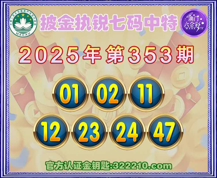 353期: 披金执锐 🏆七码中特🏆【01.02.11.12.23.24.47】开:01